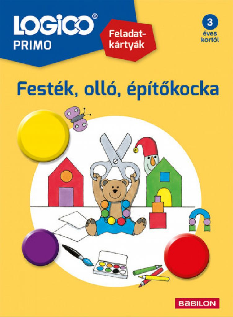 A LOGICO PRIMO innovatív tanulójáték - az óvodások napirendjébe beépíthetően - a következő területek fejlesztéséhez kínál játékos gyakorlatokat: érzékelés, koncentráció, mennyiségek és színek ismerete, térbeli tájékozódás, nyelvi kifejezésmód, tárgyi információk, valamint hozzárendelések és analógiaképzés révén logikai összefüggések keresése. A Festék, olló, építőkocka az alábbi témákat dolgozza fel: azonosak párosítása, térbeli helyzet felismerése, színek és formák. 3 éves kortól ajánljuk. A csomag 16 feladatkártyát tartalmaz. A kártyák a PRIMO kerettel együtt használhatóak. A keret könnyen kezelhető, fejleszti a vizuális észlelést, a szem- és kézkoordinációt. A kerethez rögzített korongok tologatásával bejelölhető a helyes megoldás. A kartonlapokra így nem kell írni, újra és újra felhasználhatóak. A korong tologatása a kötött pályán kiválóan alkalmas az írás előkészítéshez